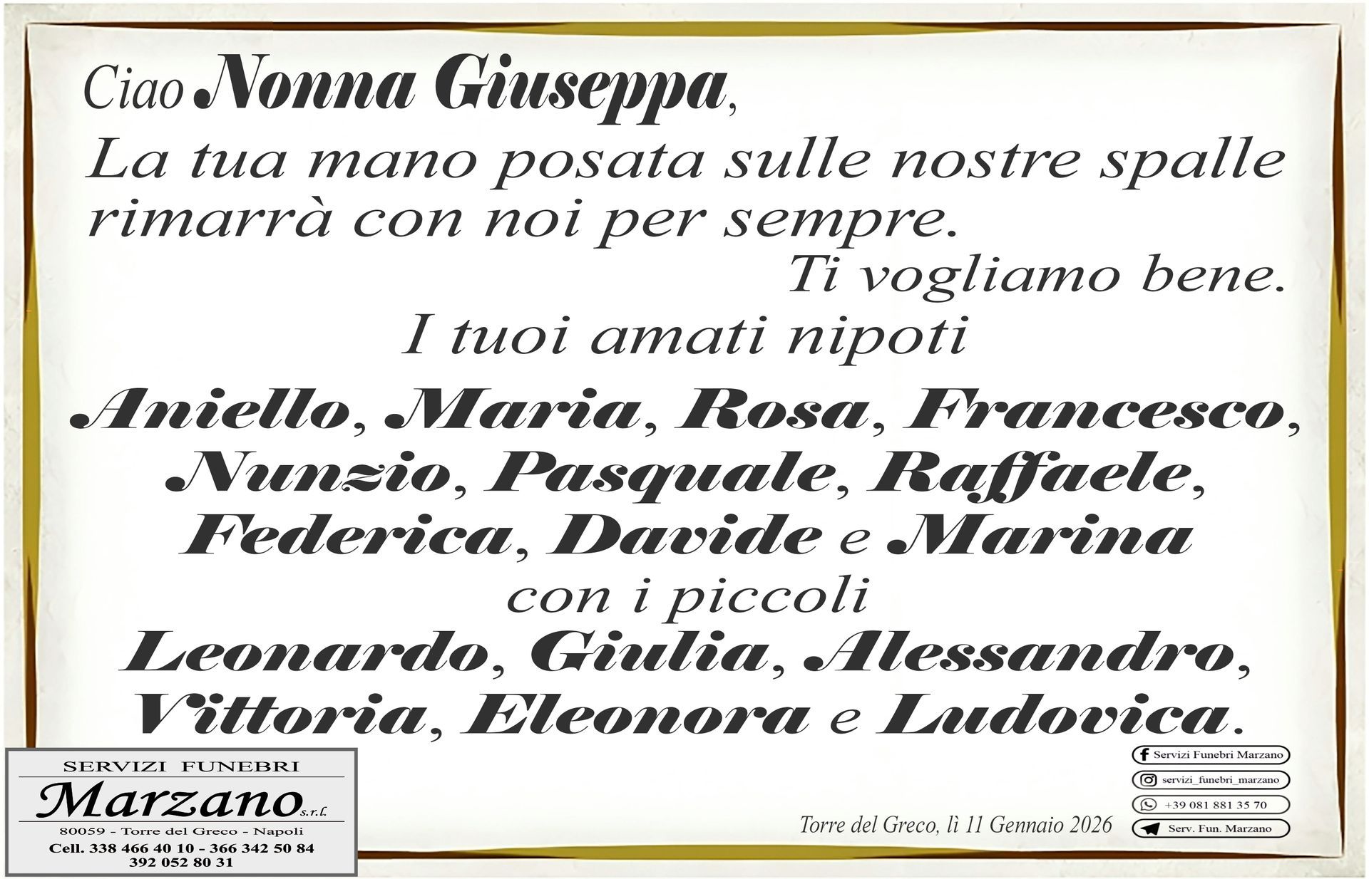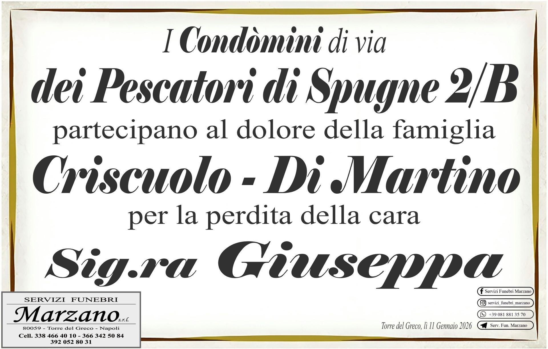 I funerali si svolgeranno lunedì 12 Gennaio 2026, alle ore 10:00, da via dei Pescatori di Spugne 2/B Portami qui! (Abitazione) per la Parrocchia S. Maria del Principio in Torre del Greco. Portami qui!